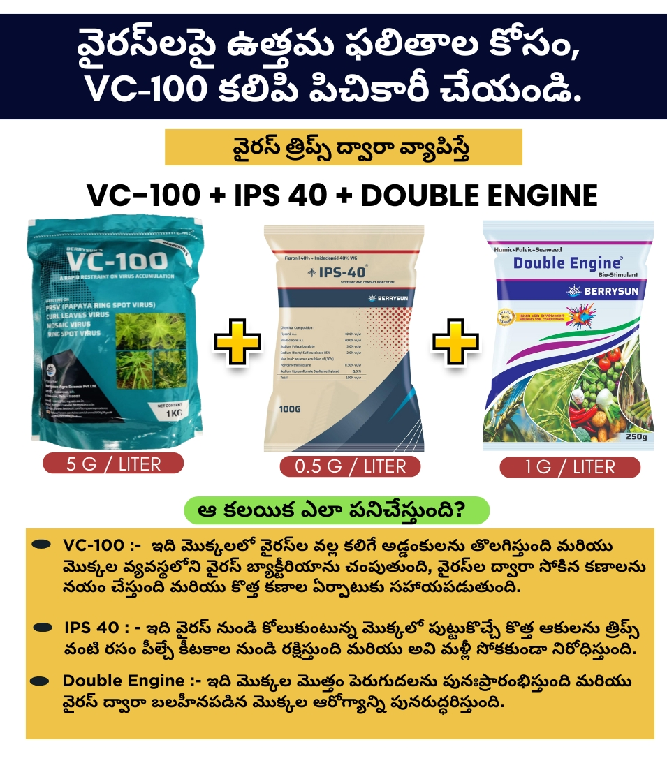 The Berrysun VC-100 + Aceta Pro + Double Engine Combo is a powerful three-in-one crop protection solution designed to manage viral stress, control sucking insect pests, and enhance overall plant growth. This combo provides comprehensive protection for crops like chilli, tomato, papaya, brinjal, bitter gourd, capsicum, tobacco, okra, green gram, and other vegetables & field crops.