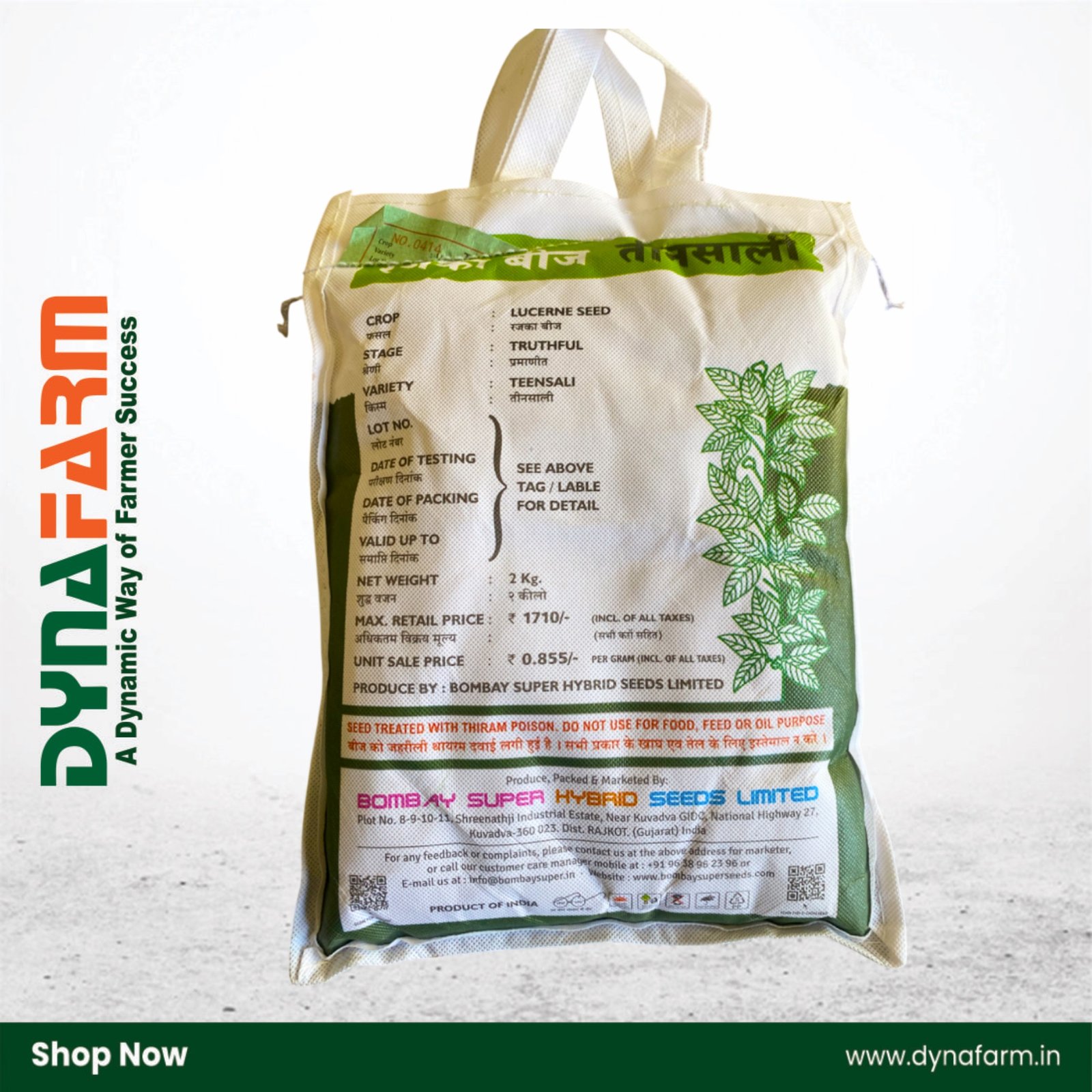 Teensali is a high-yielding lucerne (alfalfa) variety offered by Bombay Super, ideal for multi-year fodder production (3 years). It produces dense, green foliage, with good regrowth and nutritive value, making it a top choice for livestock feed.