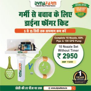 The Dyna Fogger Kit for Dairy Farm is an effective mist cooling system for cow sheds, dairy farms, restaurants, and outdoor areas. This kit includes 10 high-quality brass fogger nozzles, a booster pump, 60-feet pipe, and a 10-inch bowl filter to deliver fine mist cooling during extreme summer heat.