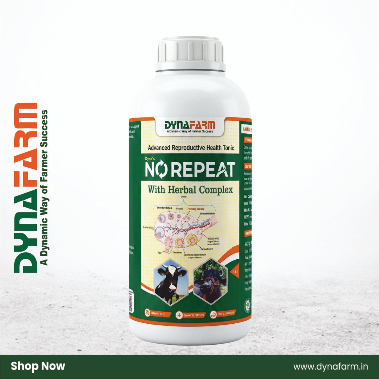 No Repeat is a premium livestock reproductive nutrition supplement formulated to support overall nutritional balance and reproductive wellness in cattle and buffalo. This advanced herbal-based liquid formula contains essential vitamins, minerals, amino acids, trace elements, and plant extracts that complement regular feeding programs in dairy and livestock farms.