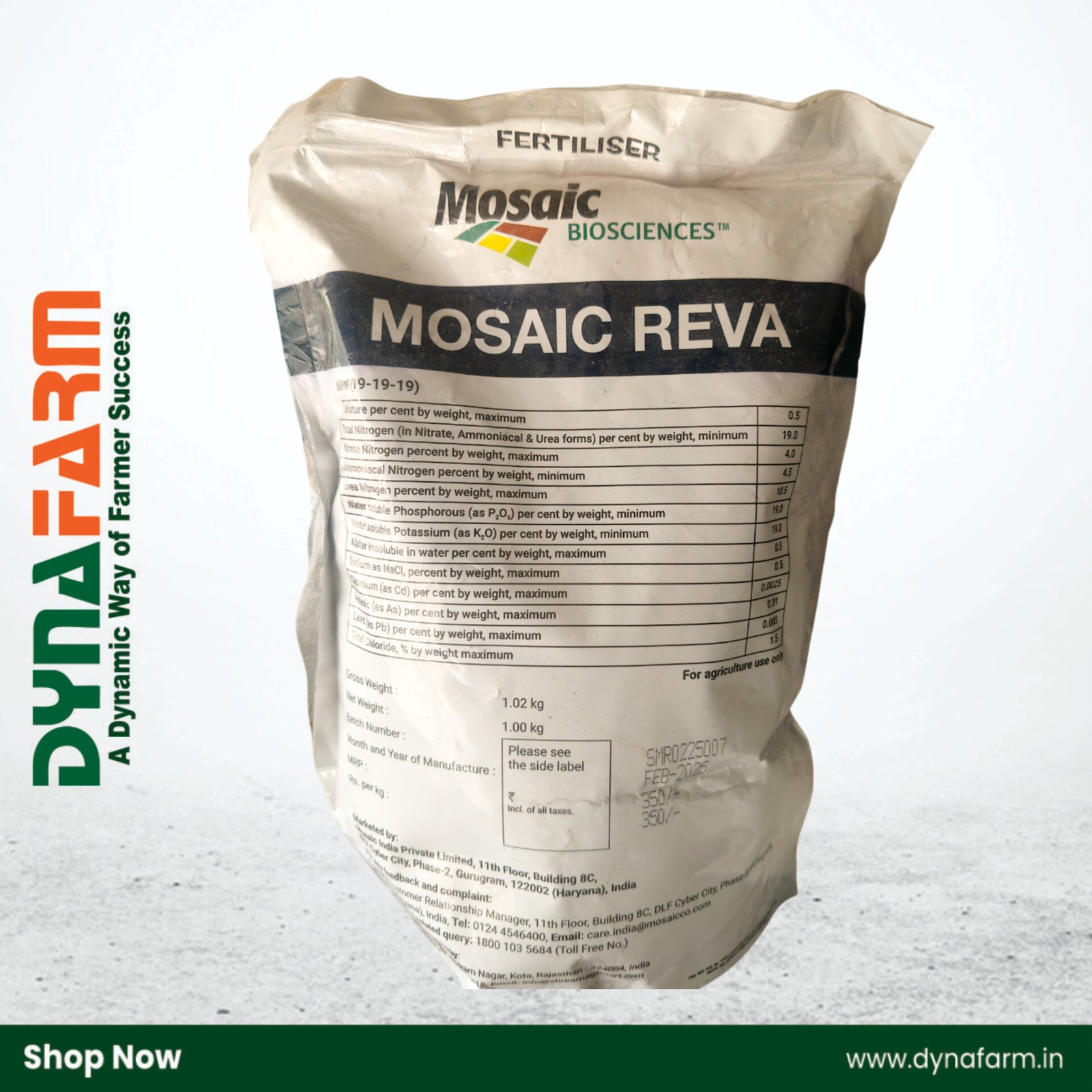 Mosaic Reva NPK 19-19-19 is a premium quality starter grade balanced water soluble fertilizer containing equal proportions of Nitrogen (19%), Phosphorus (19%), and Potassium (19%). It is specially formulated to provide complete and balanced nutrition during the early stages of crop growth.