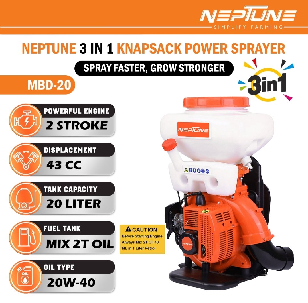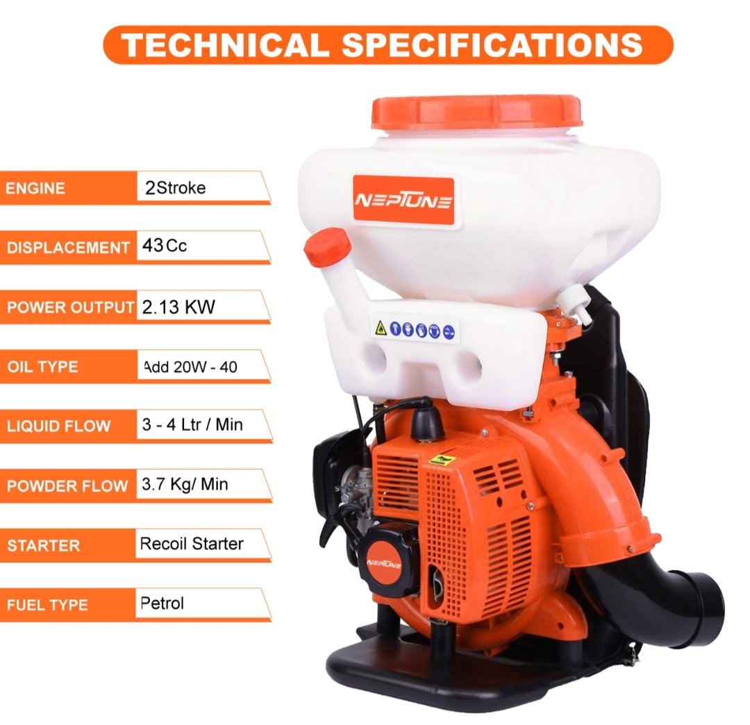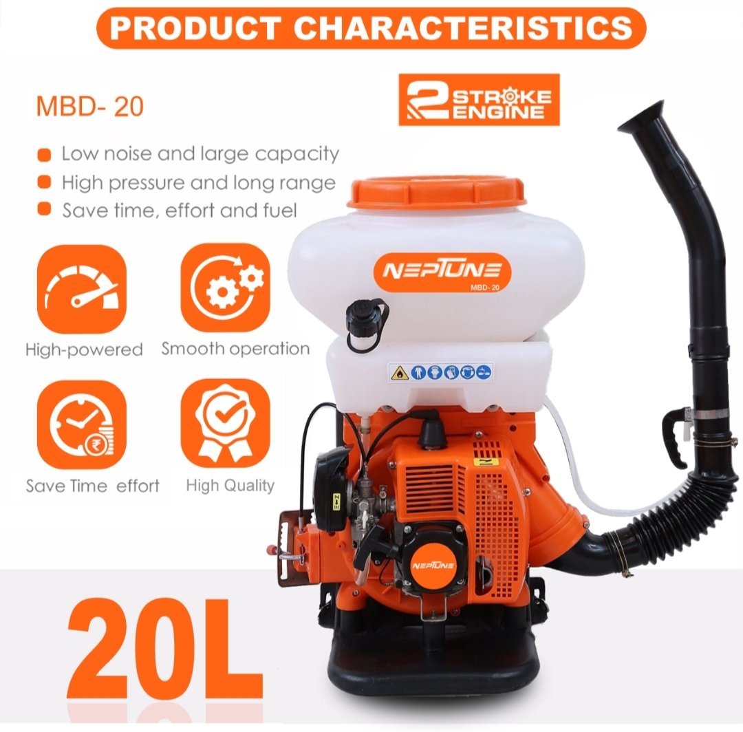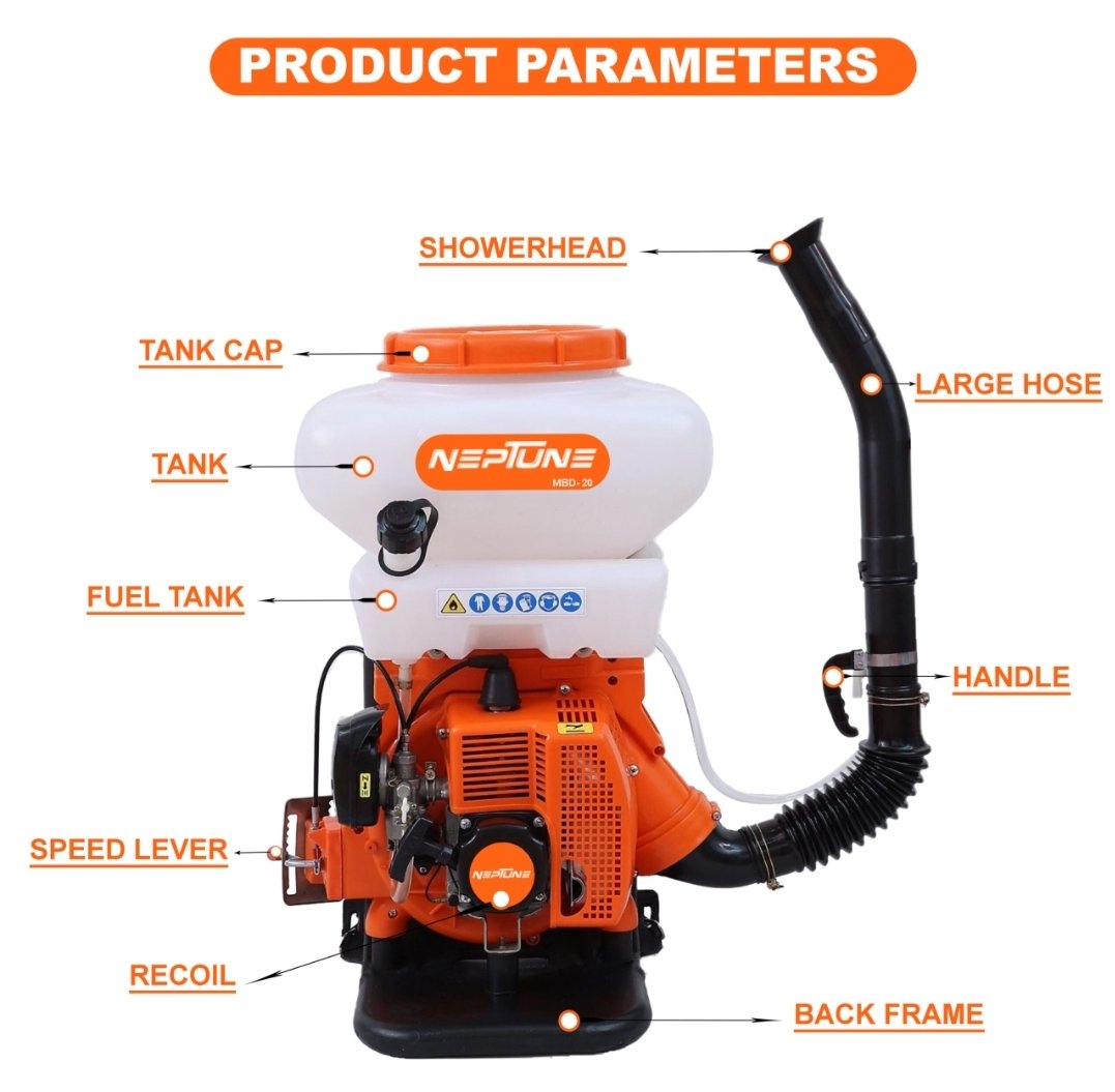 The Neptune MBD‑20 is a highly efficient 2‑in‑1 power sprayer that combines liquid fogging and powder dusting in one compact backpack unit. Powered by a 43 cc 2‑stroke petrol engine (2.13 kW) with CDI ignition, it delivers maximum atomization—3 L/min liquid or 3.7 kg/min powder—and a spray reach of up to 12 m, making it ideal for pest control, agriculture, orchard care, and disinfection tasks.