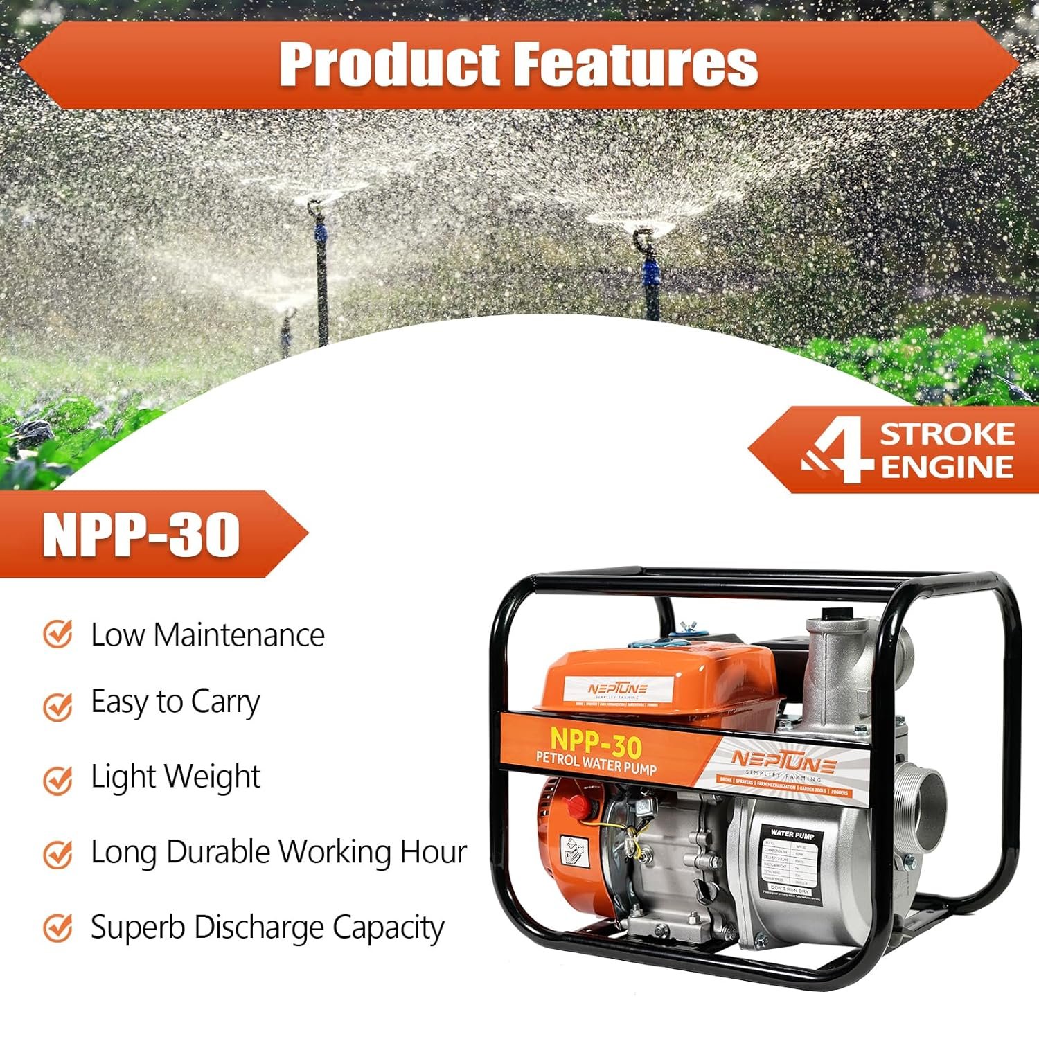 Neptune NPP-30 water pump, 6.5 HP petrol water pump, 196 cc pump 3 inch, irrigation pump India, high lift water pump petrol, farm water pump set.
