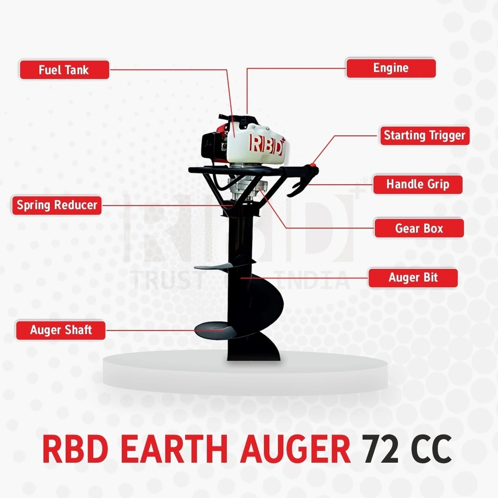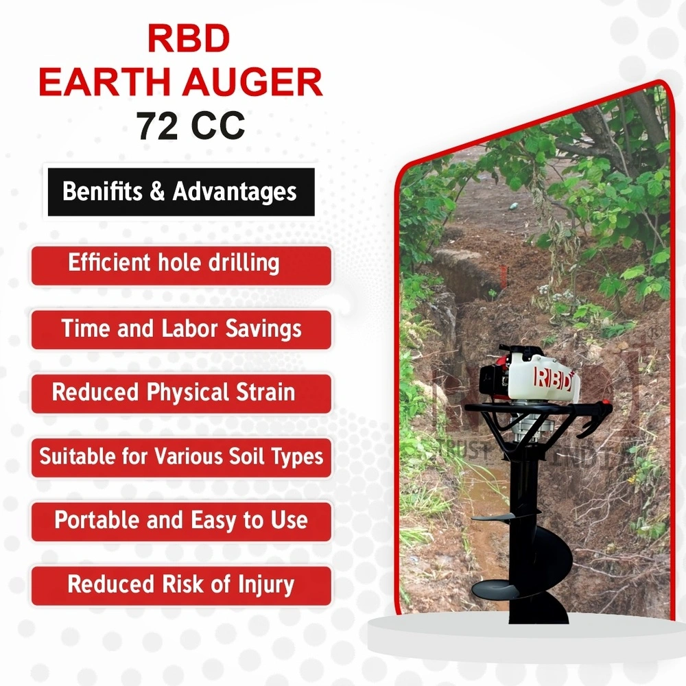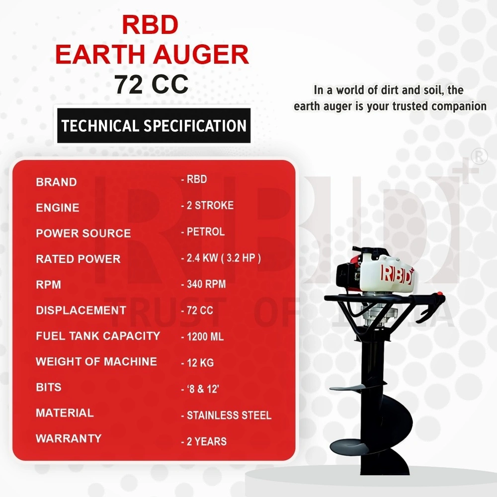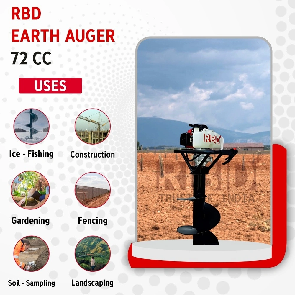 The RBD Earth Auger 72CC is a high-performance petrol-powered earth auger designed to make hole drilling tasks fast, efficient, and effortless. Perfect for fencing, plantation, landscaping, drilling for poles, posts, and saplings — this machine delivers strong torque and excellent digging power. Built with a reliable 72CC engine, sturdy auger bit, and ergonomic handles, the RBD Earth Auger helps farmers, contractors, and landscapers complete ground-drilling jobs with precision and ease.