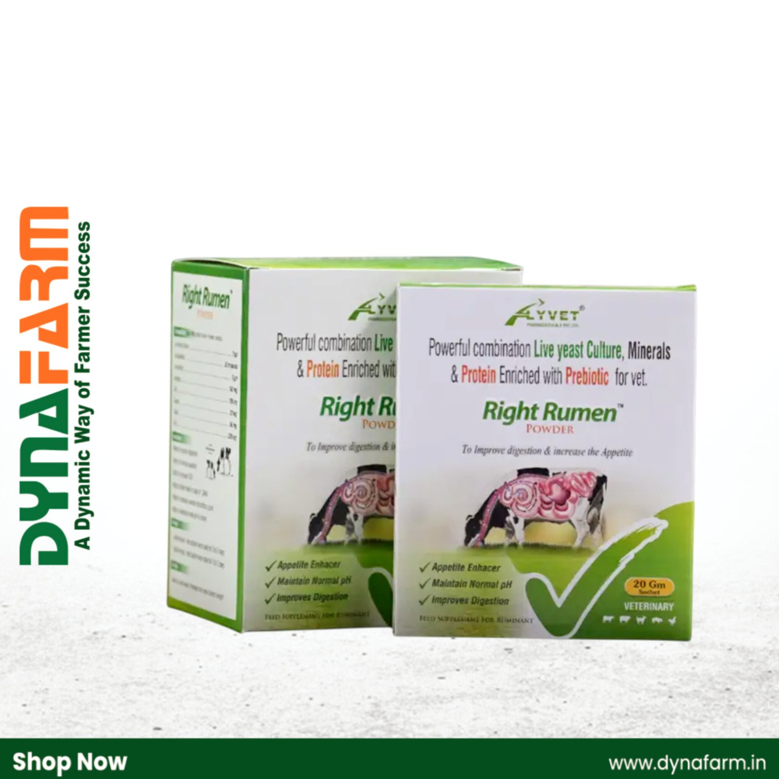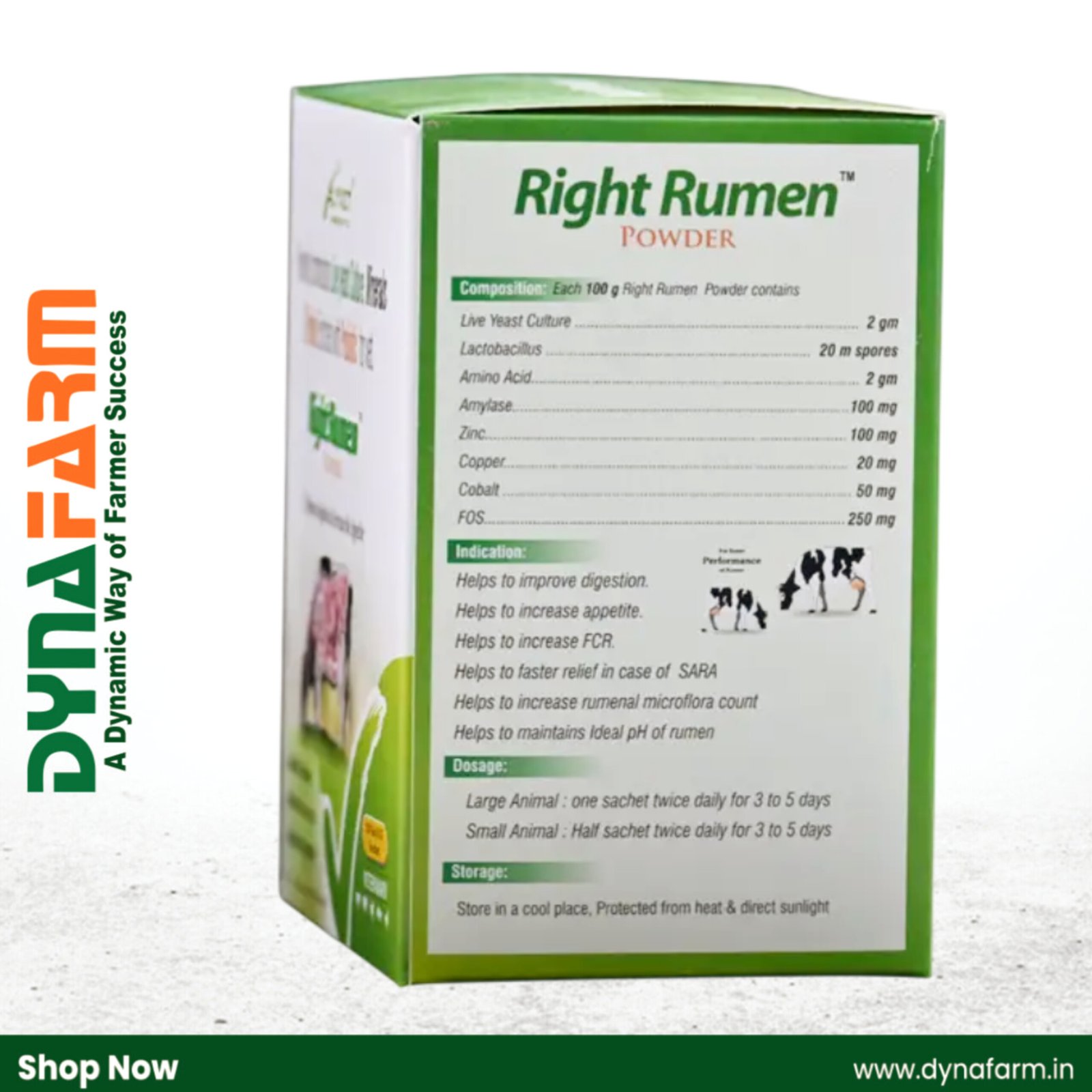 This formulation helps enhance fiber digestion, appetite, and nutrient absorption, leading to better milk production, improved body condition, and overall productivity. Regular use of Right Rumen supports a healthy rumen environment and helps prevent common digestive disorders.