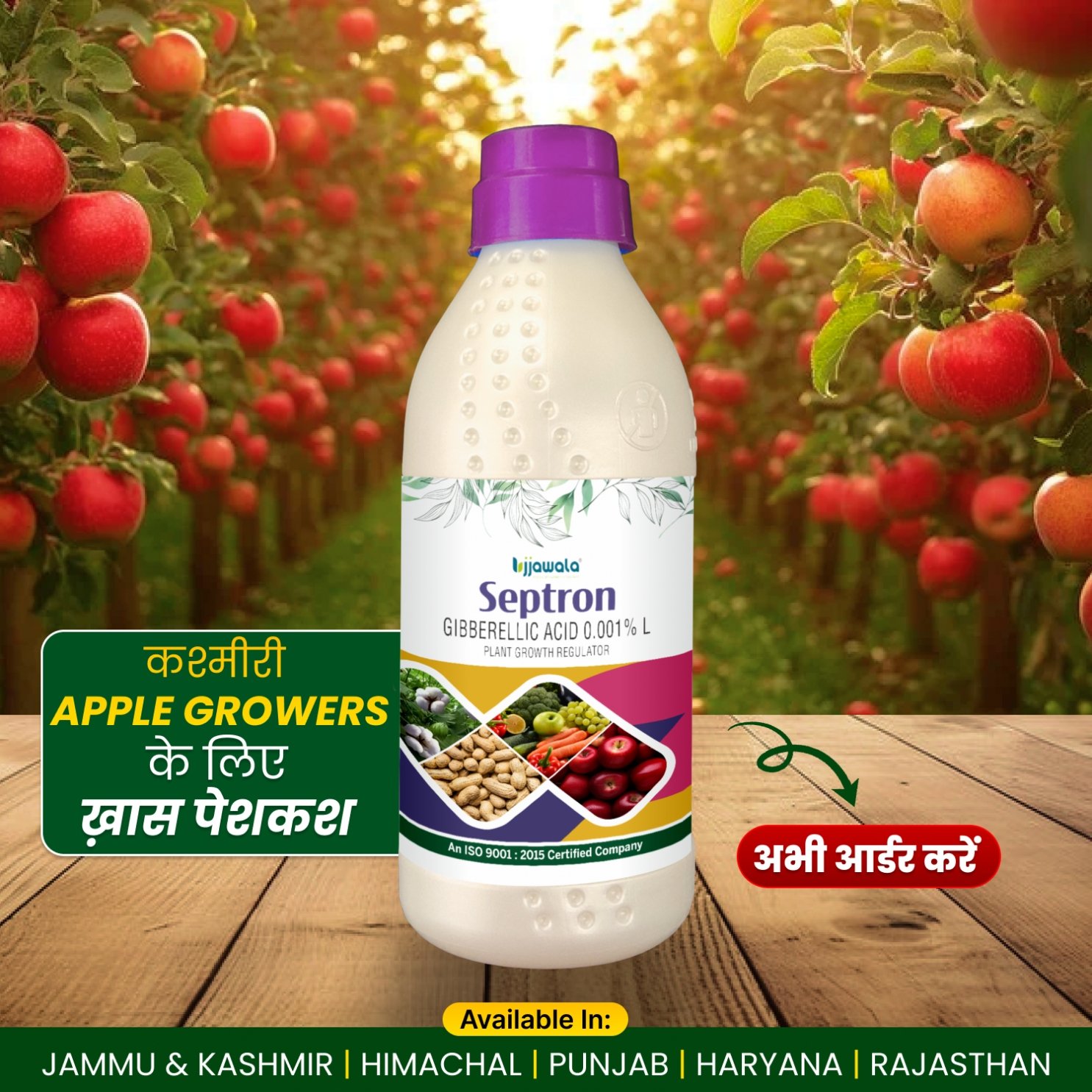 Ujjawala Septron Growth Regulator is a highly effective plant growth promoter formulated with Gibberellic Acid (GA3) that stimulates faster plant growth, improved flowering, and higher crop yield.