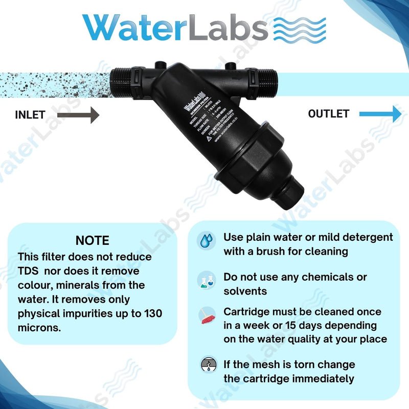 | Key Specs | Brand: WaterLabs Model: WL0625 Filter Type: 130 Micron Screen Mesh Material: Premium Stainless Steel Inlet / Outlet: 1″ (25 mm) Max Flow Rate: 5,000 L/h Operating Pressure: Up to 5 bar Sealing Type: O-ring for leak-free connection |